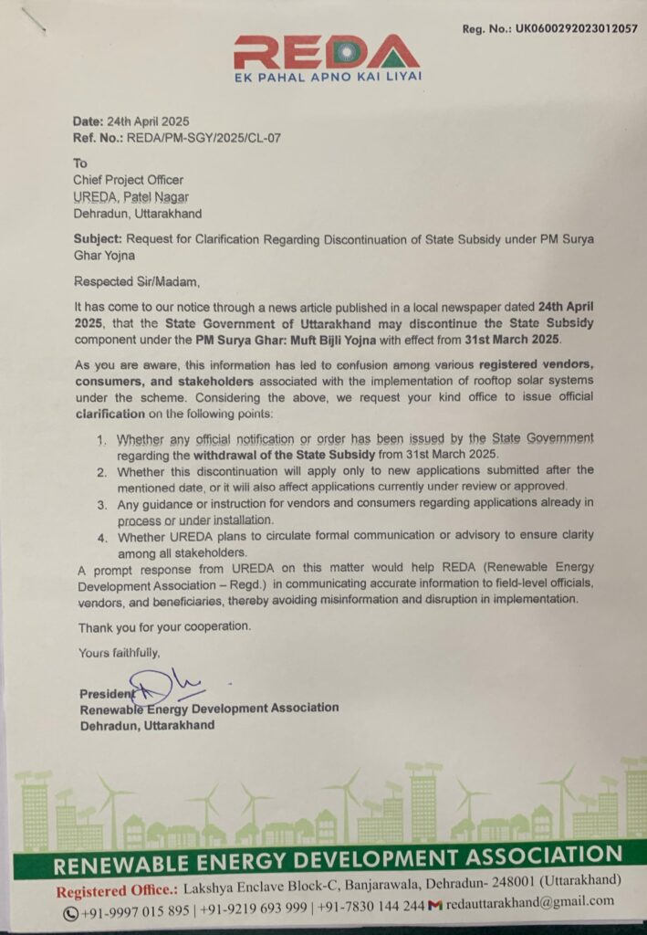 उत्तराखंड सरकार ने ‘प्रधानमंत्री सूर्य घर योजना’ के तहत दी जाने वाली राज्य की सब्सिडी को बंद करने का फैसला किया है। इस योजना के तहत घरेलू छतों पर सोलर पैनल लगवाने वाले उपभोक्ताओं को अब सिर्फ केंद्र सरकार की ओर से मिलने वाली अधिकतम ₹85,800 की सब्सिडी ही मिलेगी। राज्य सरकार द्वारा दी जा रही अधिकतम ₹51,000 तक की सहायता अब नहीं दी जाएगी।